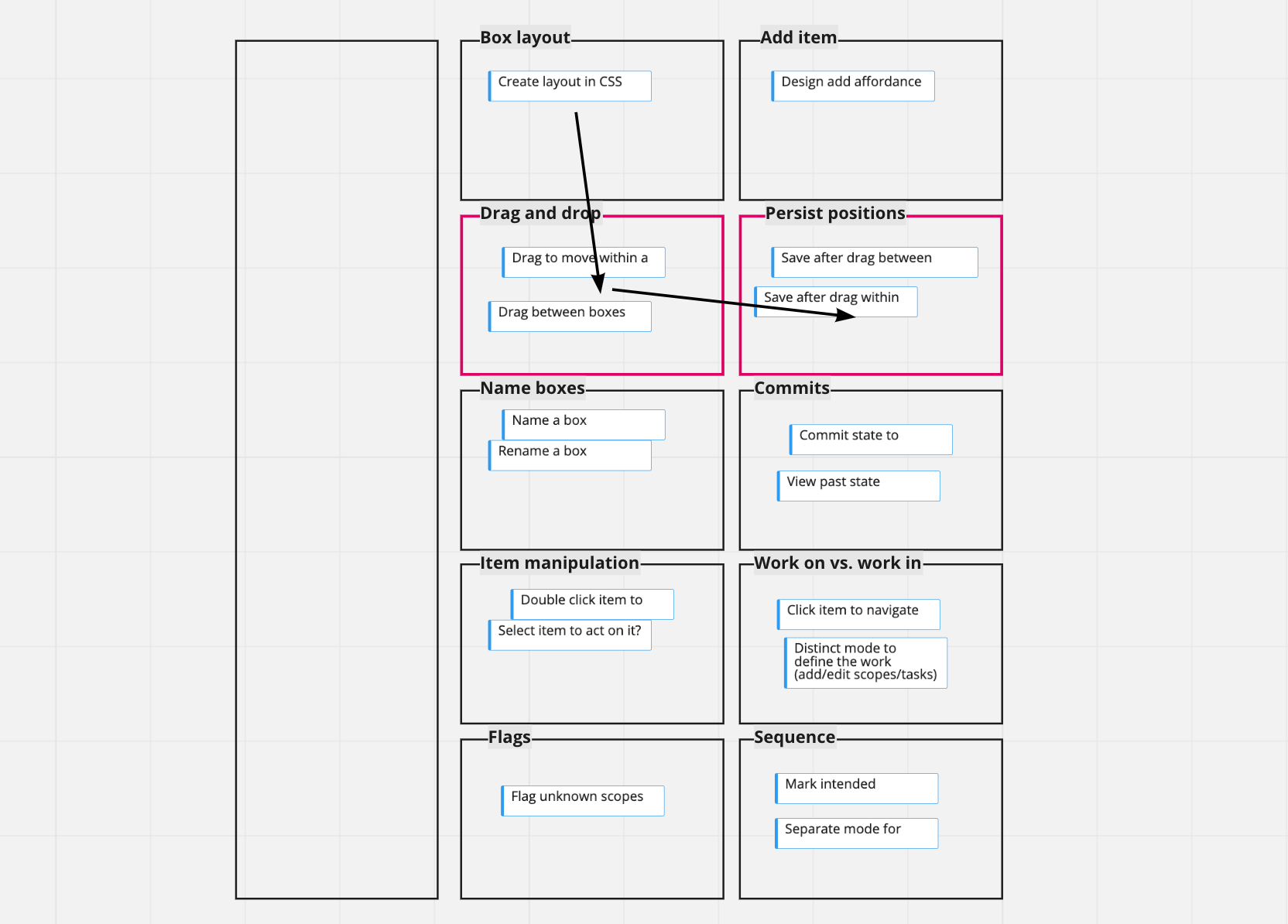 I want to prototype a drag and drop interface to do this kick-off exercise. My plan of attack looks like the screenshot below. I sketched eight scopes at the start based on a handful of imagined tasks that I dumped. I wanted to get into "Drag and drop" and "Persist positions" as fast as possible because they are the most valuable with the most unknowns. To get to those, I needed to make a basic layout of boxes and tasks in CSS that renders inside an app template in CSS ("Box layout").