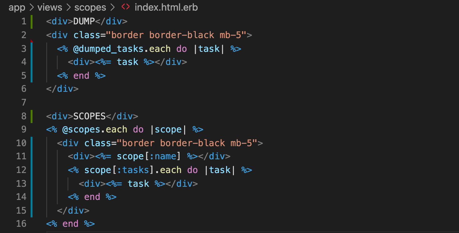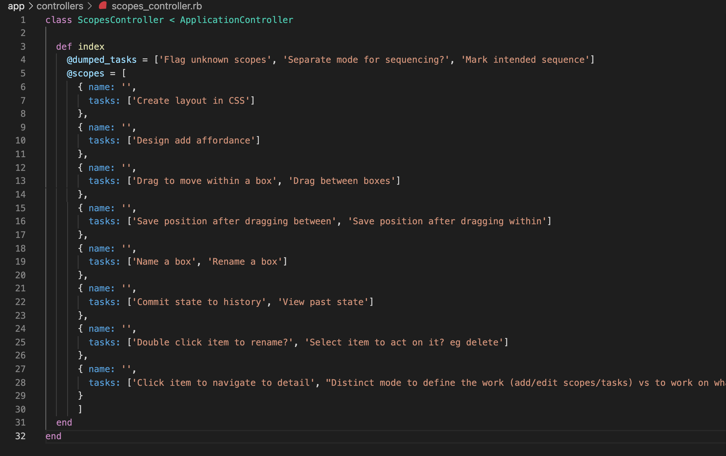 But setting up the Rails app sparked discovered tasks. I had to set up a controller action accessible via some route to render a template. This screen is in the "middle" of the app. It's not the first thing you see, and it probably belongs to some bigger thing like a Project and/or an Account. The Scopes and Task data that I wanted to render on this template probably should hang off those somehow. As I opened the routes config file, I wondered ... do I need to include the project in the route, like `projects/:id/scopes`? If so, should I generate a basic project model now? Should I nest the scopes_controller in a 'project' module, anticipating the nesting I'll want later? What about the tasks I want to render in the template? Should I make some fixtures for them in the database first so I don't have to hard-code them in the template, which would lead to lots of duplicated markup when I'm iterating on the layout?