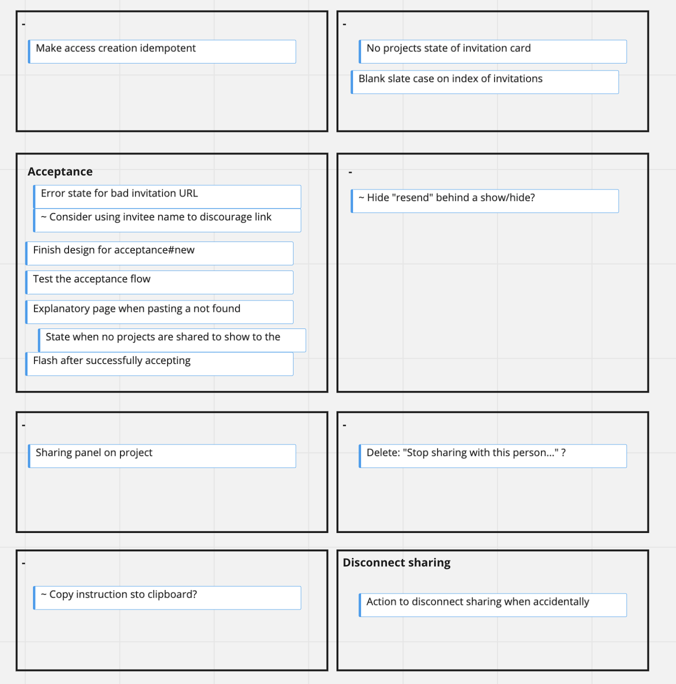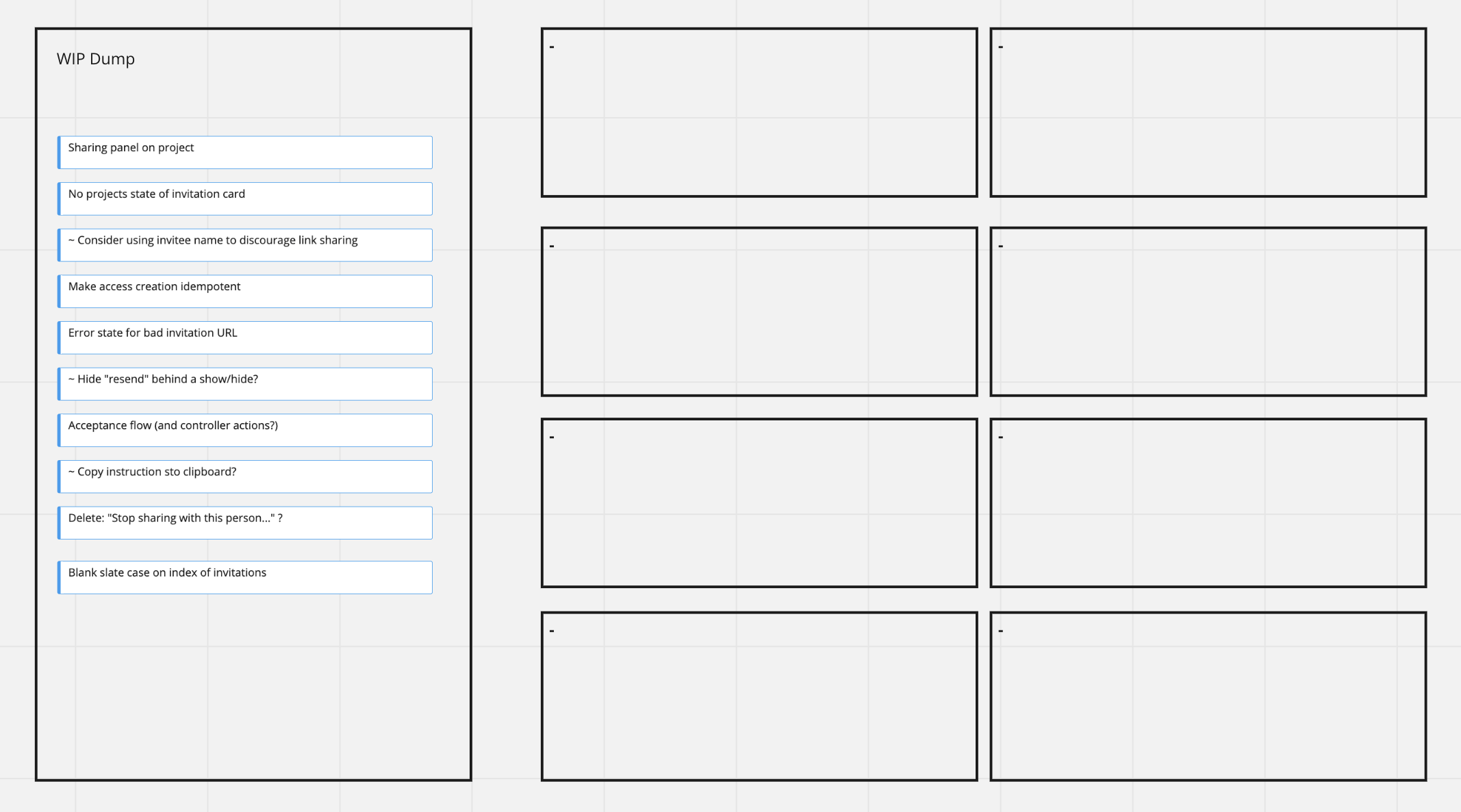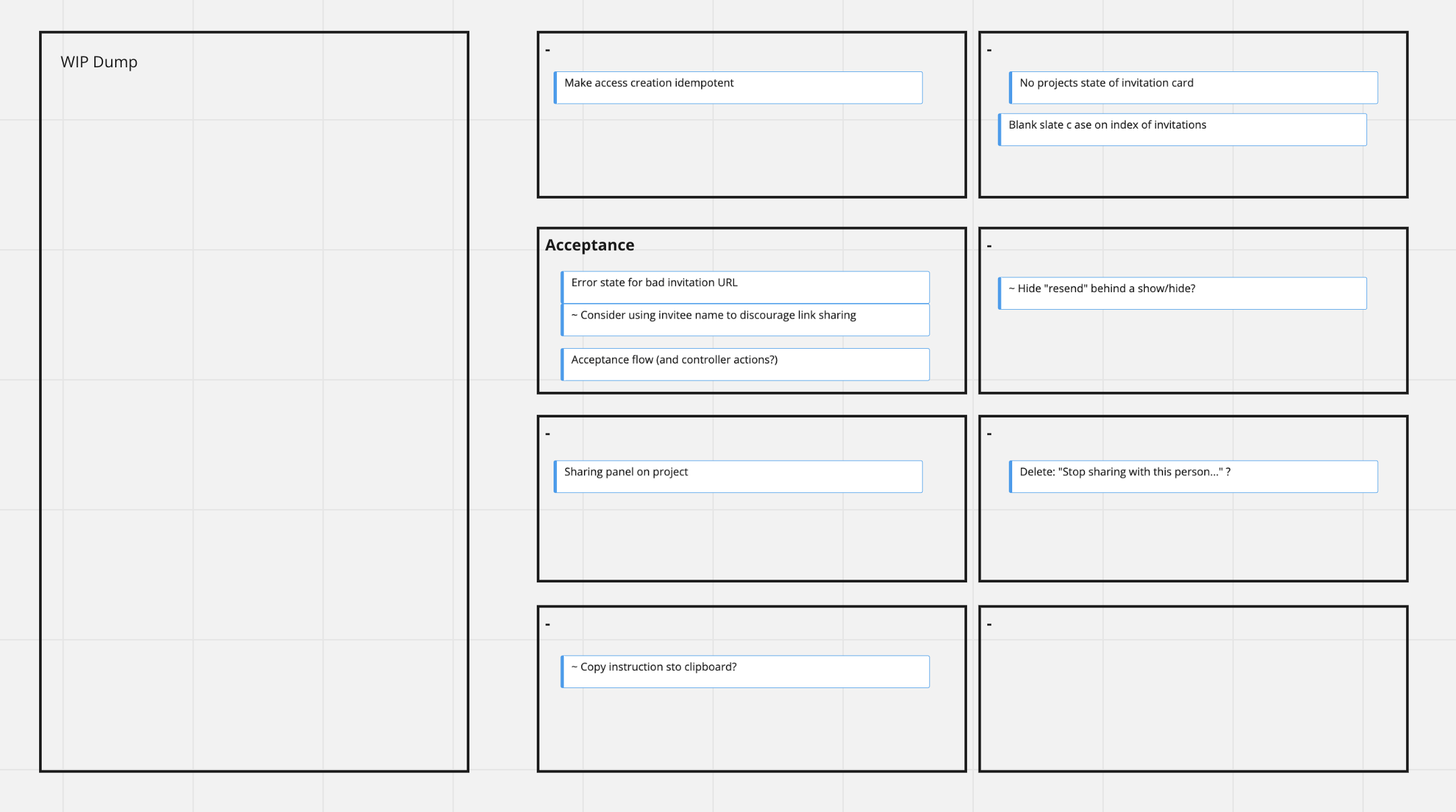 The first is affinitizing — which is like categorizing except you don't have any of the categories in advance. It's a way to chunk things up by likeness and let the categories emerge. Today I sat down to do a bunch of code and UI implementation on a project I'm wrapping up. (It's an unconventional workflow for inviting someone on another account to share data.)