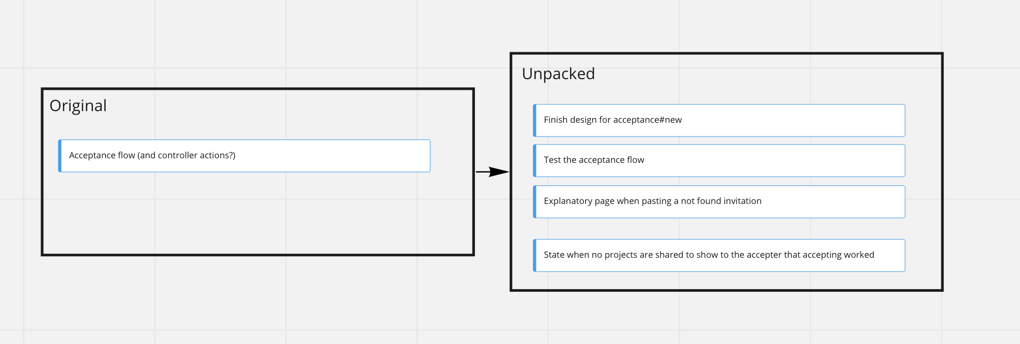 Looking inside the "Acceptance" group, one piece of work I had dumped was very fuzzy. So I reached for another tool: unpacking. This is the opposite of aggregating. It's digging inside of one thing to get more things out of it.