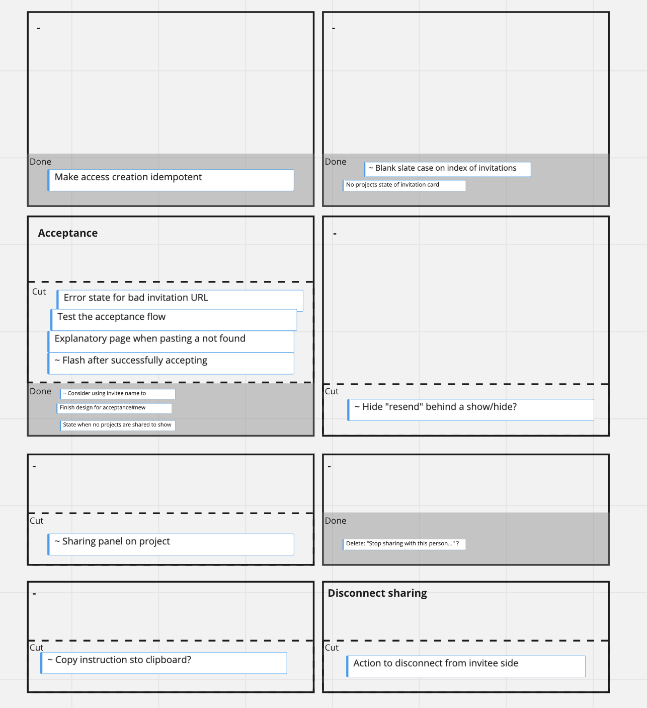Now that the work was broken into separate scopes, it was easier to dive in. But I knew I wouldn't get everything done. Today was the last day I had budgeted time to finish the feature. So instead of "doing" everything, I added another alternative: "cutting." Some stuff just wasn't going to make it into release.