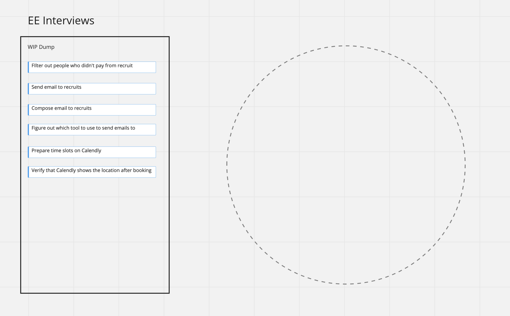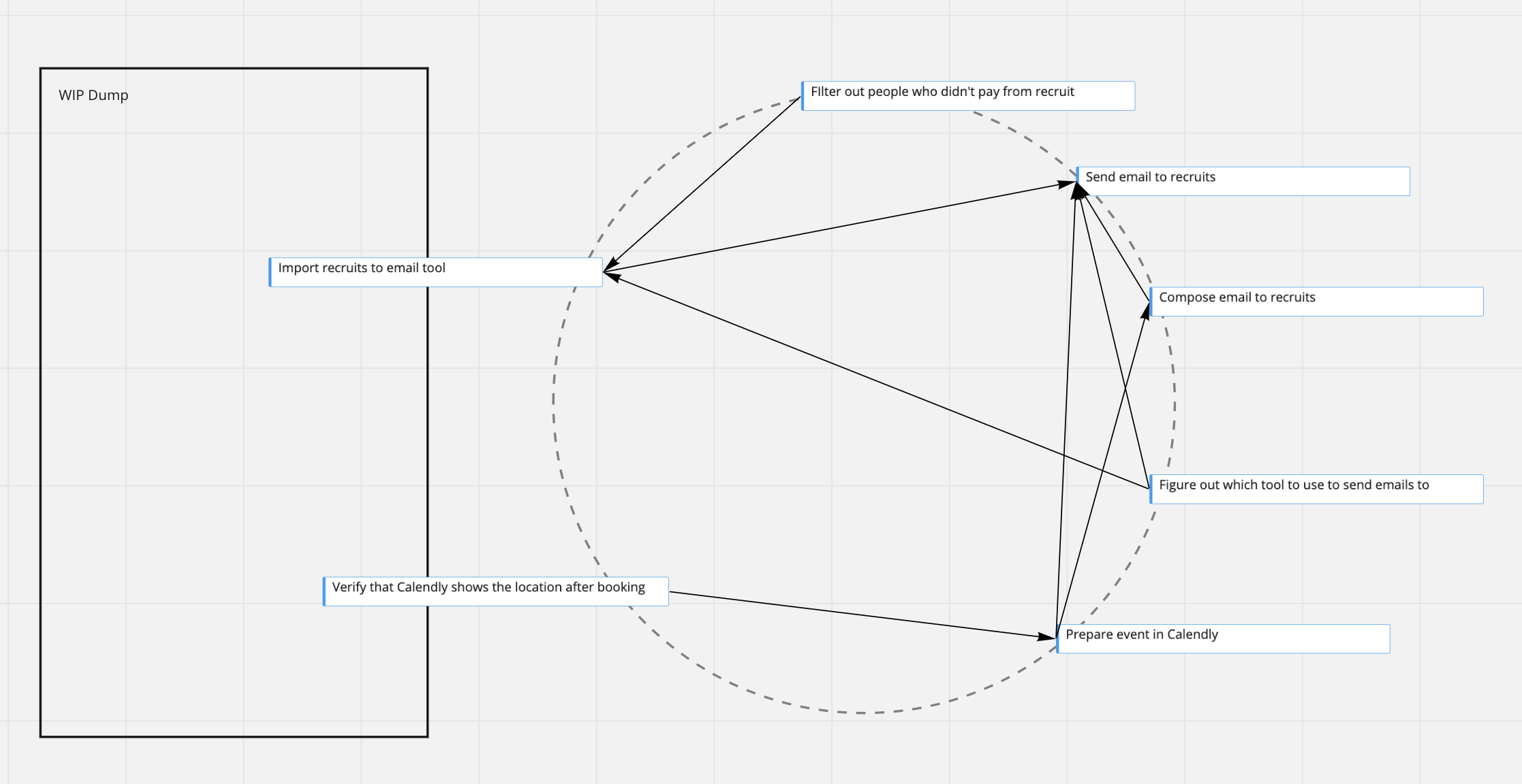 First I just dumped everything I had in my head that I thought I had to do. I made an explicit "WIP Dump" box for this on the left. Then on the right, I made a set of unnamed boxes for groupings.