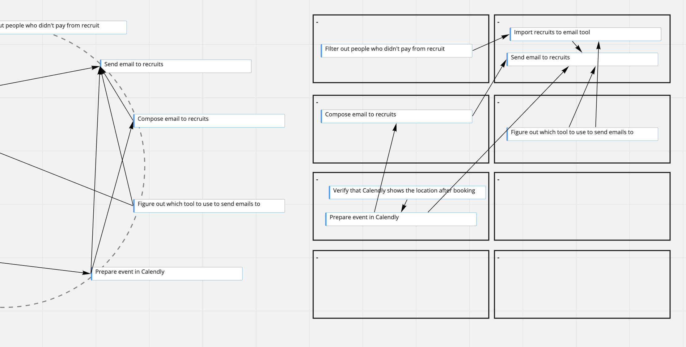 Here's where it gets a little mathy. Each of these tools can be used on the others. I didn't feel like I was getting warmer yet (it still looked like a tangle of random things) so I reached for the affinitizing tool. The arrows just followed the tasks as I dragged them into the boxes.