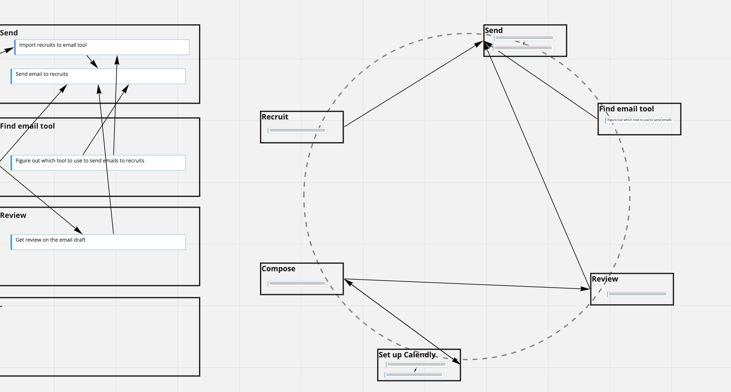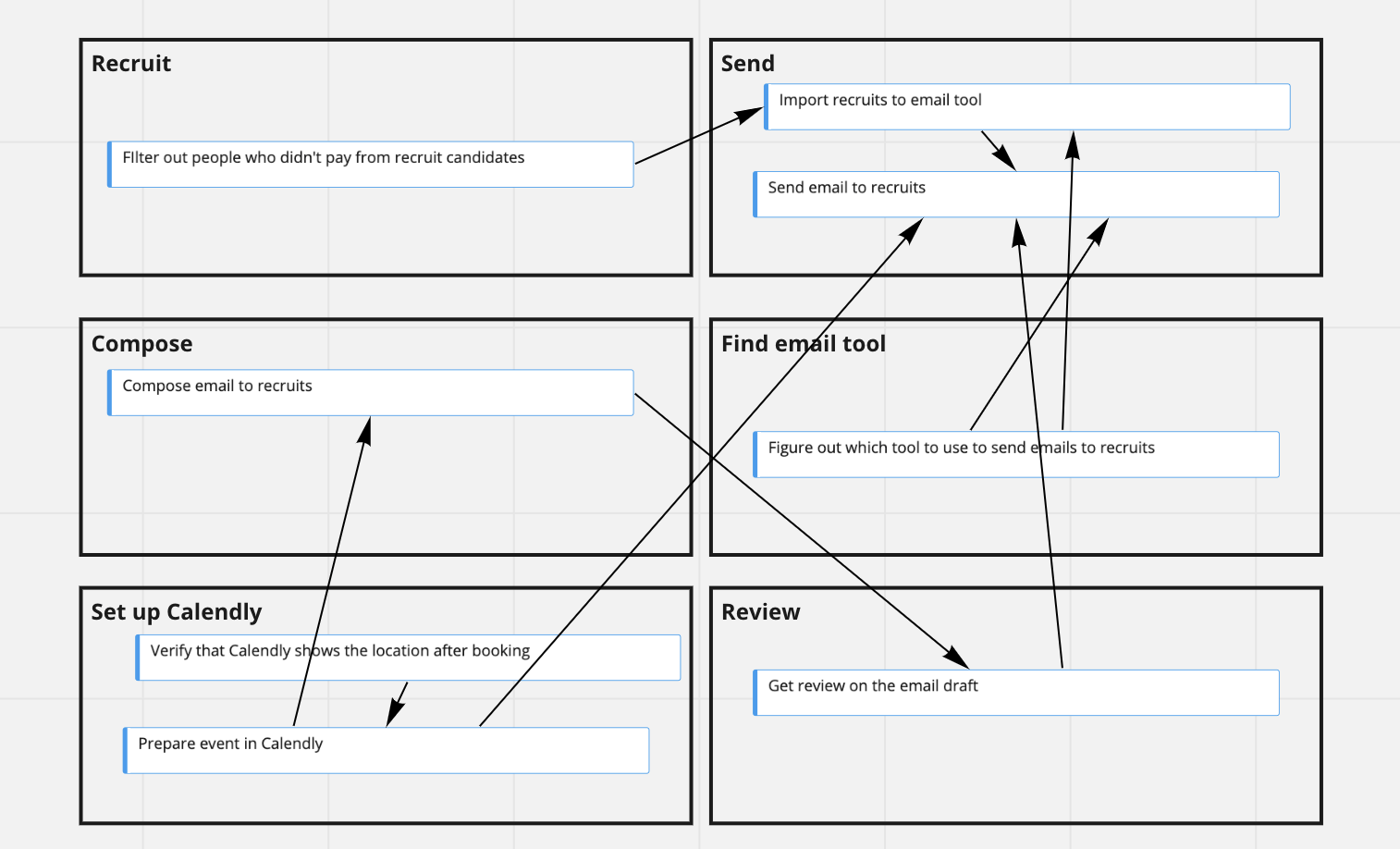 This last picture was simple enough that my brain finally relaxed. "Okay — I'll set up the Calendly event, compose the recruit email, send that for review, and ... while waiting on that ... start on the last recruit steps and pick the email tool for blasting."