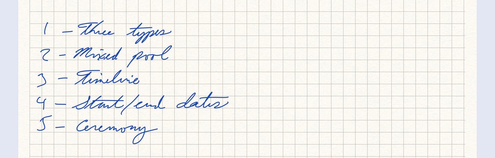 The interrelationship diagram is never perfect. It just has to be good enough to give me ideas about sequence — what to do in what order. Now I see the mixed pool (2) and ceremony (5) as the starting points for everything else.