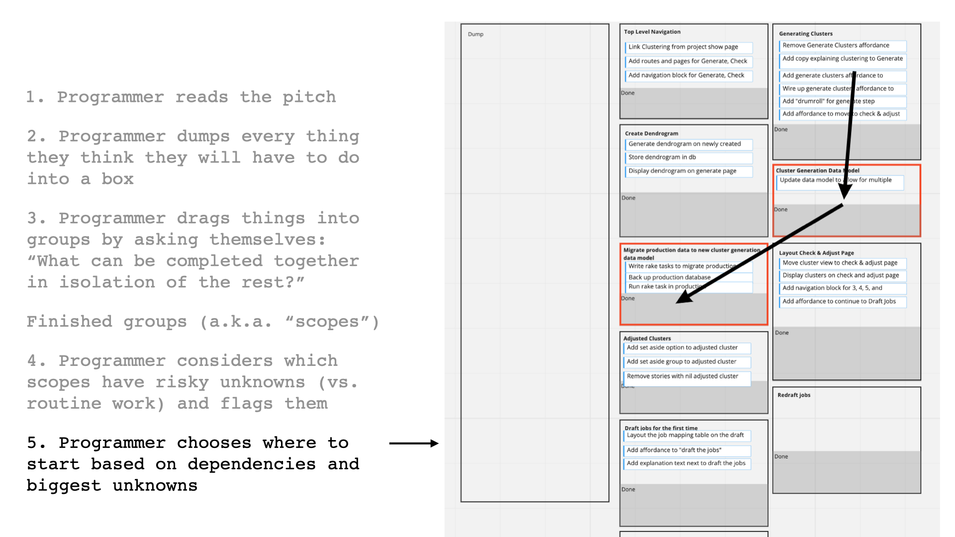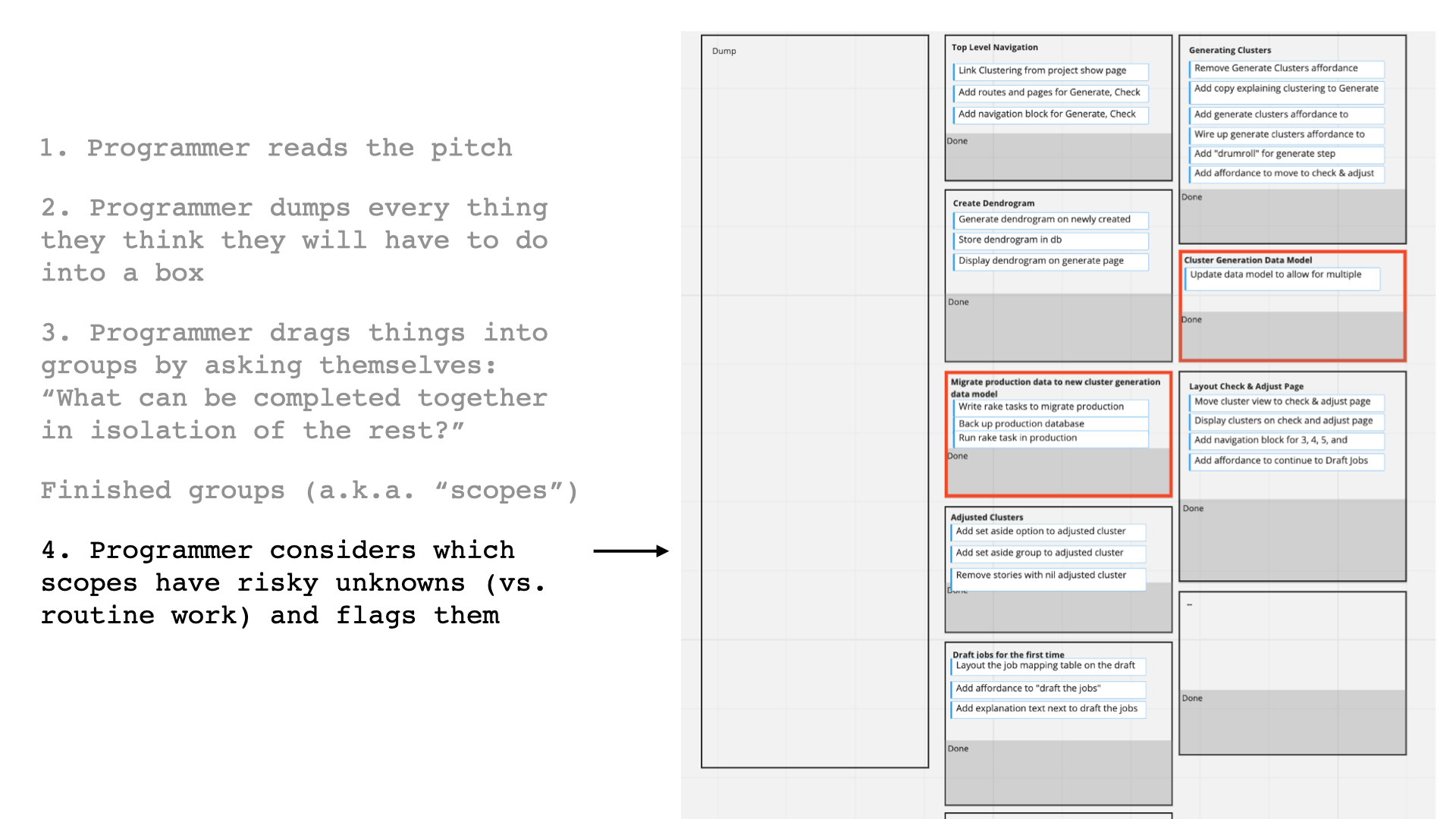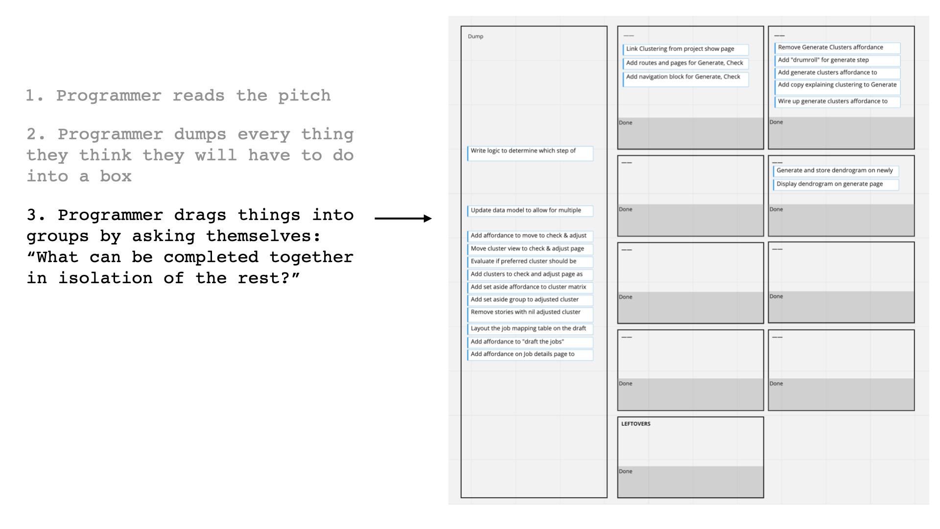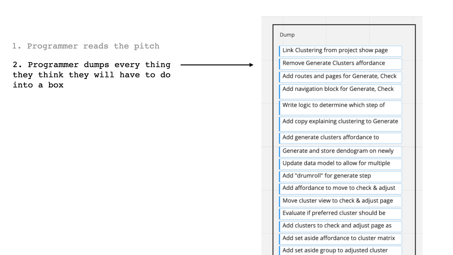 Then, the programmer dumped every task they could think of into a box. This helped them consider the pitch as a whole by turning the whole thing into rough implementation tasks, before they started on any one area.