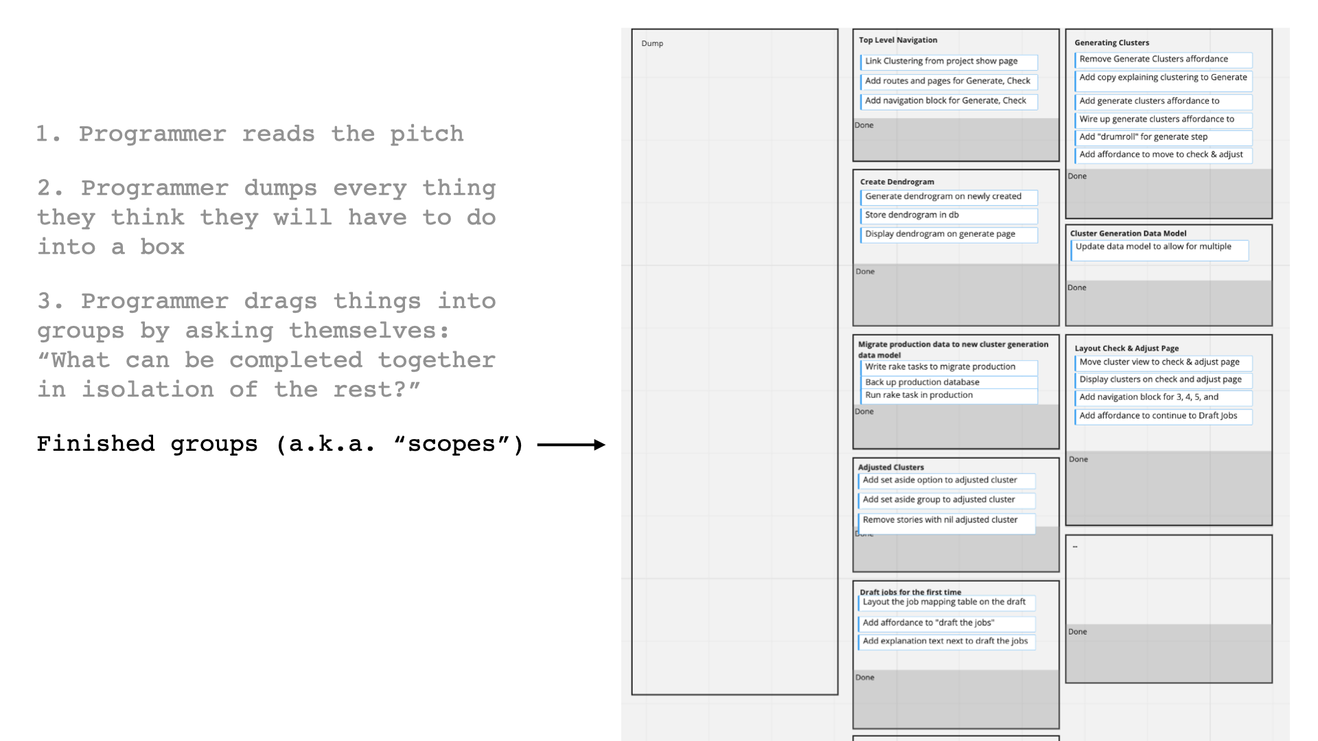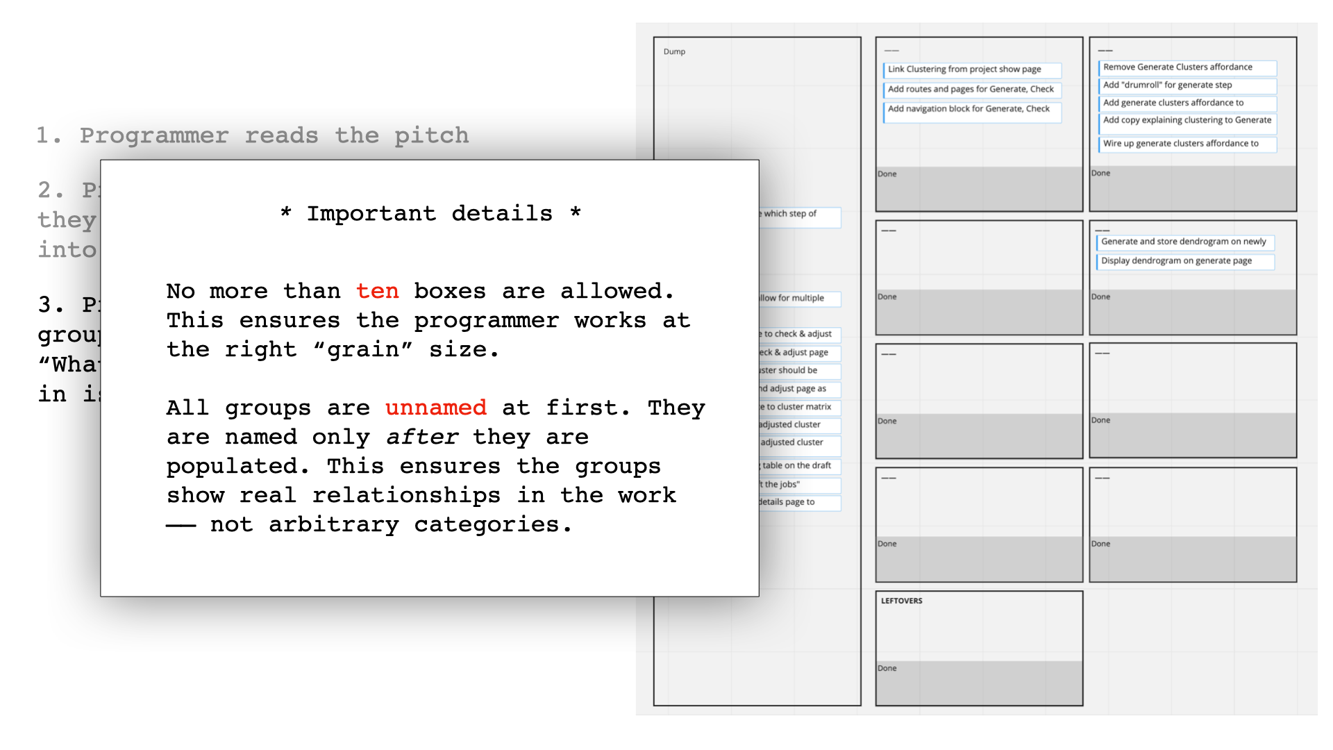 - The boxes are all unnamed at first. They only get names after they are filled. This ensures that the programmer looks at the actual work to decide what belongs together instead of using pre-conceived categories.