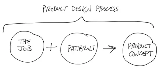 I’m going to describe the problem you are addressing as the job a user is trying to do. We’ll look at the bag of tricks you bring to the problem in terms of patterns you’ve seen and applied before. After you know the job your product is supposed to do, and you have a collection of patterns from past experience, you can create a product concept. The concept unifies the relevant patterns you know into a composite design that does the job.